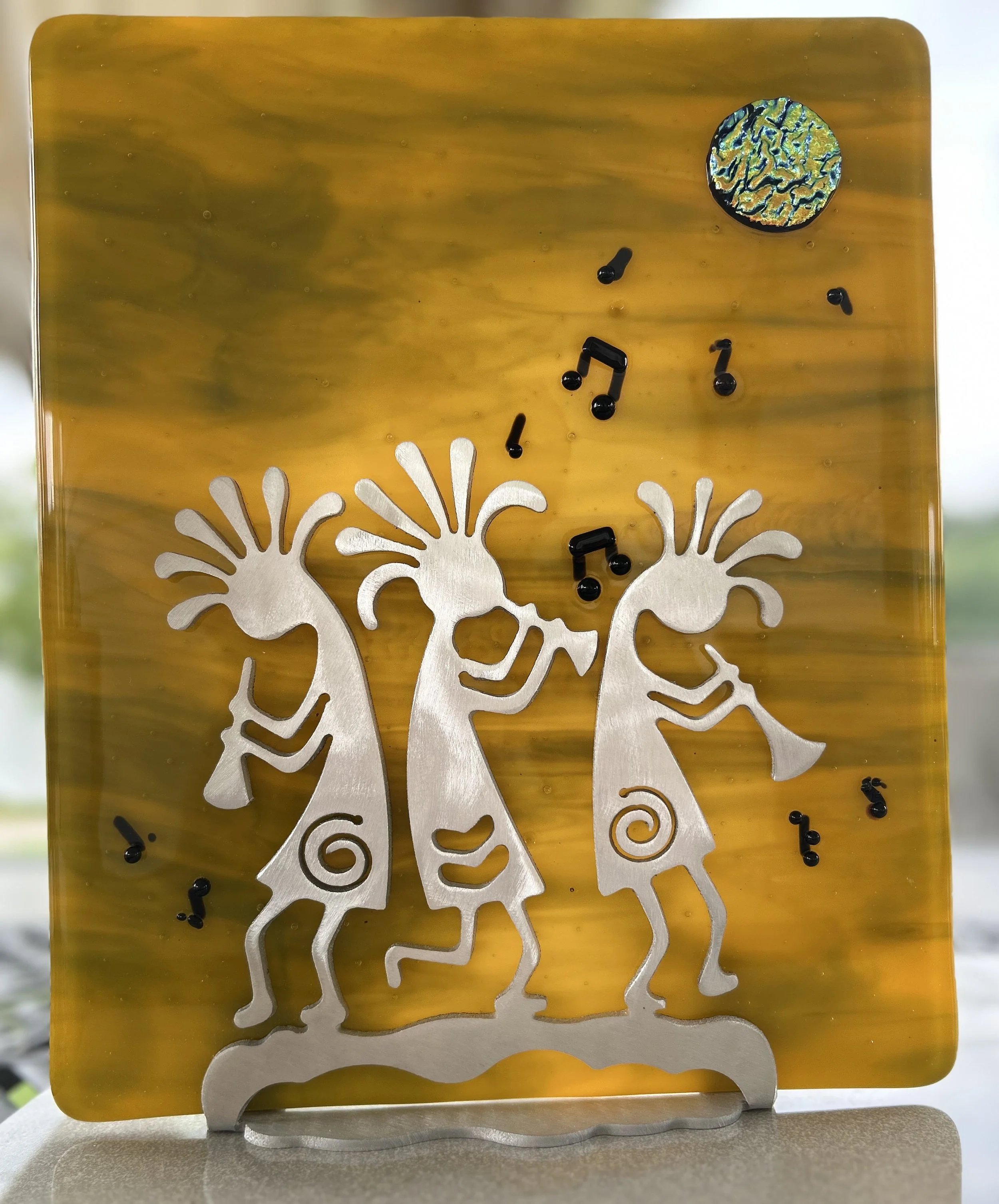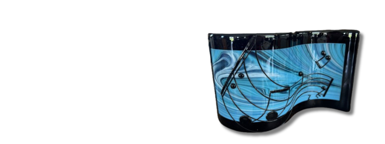 On the right, one can find a stunning custom glass piece that features an enchanting blue swirl gracefully positioned behind an arrangement of delicately swaying musical notes, creating a visually appealing and harmonious composition.