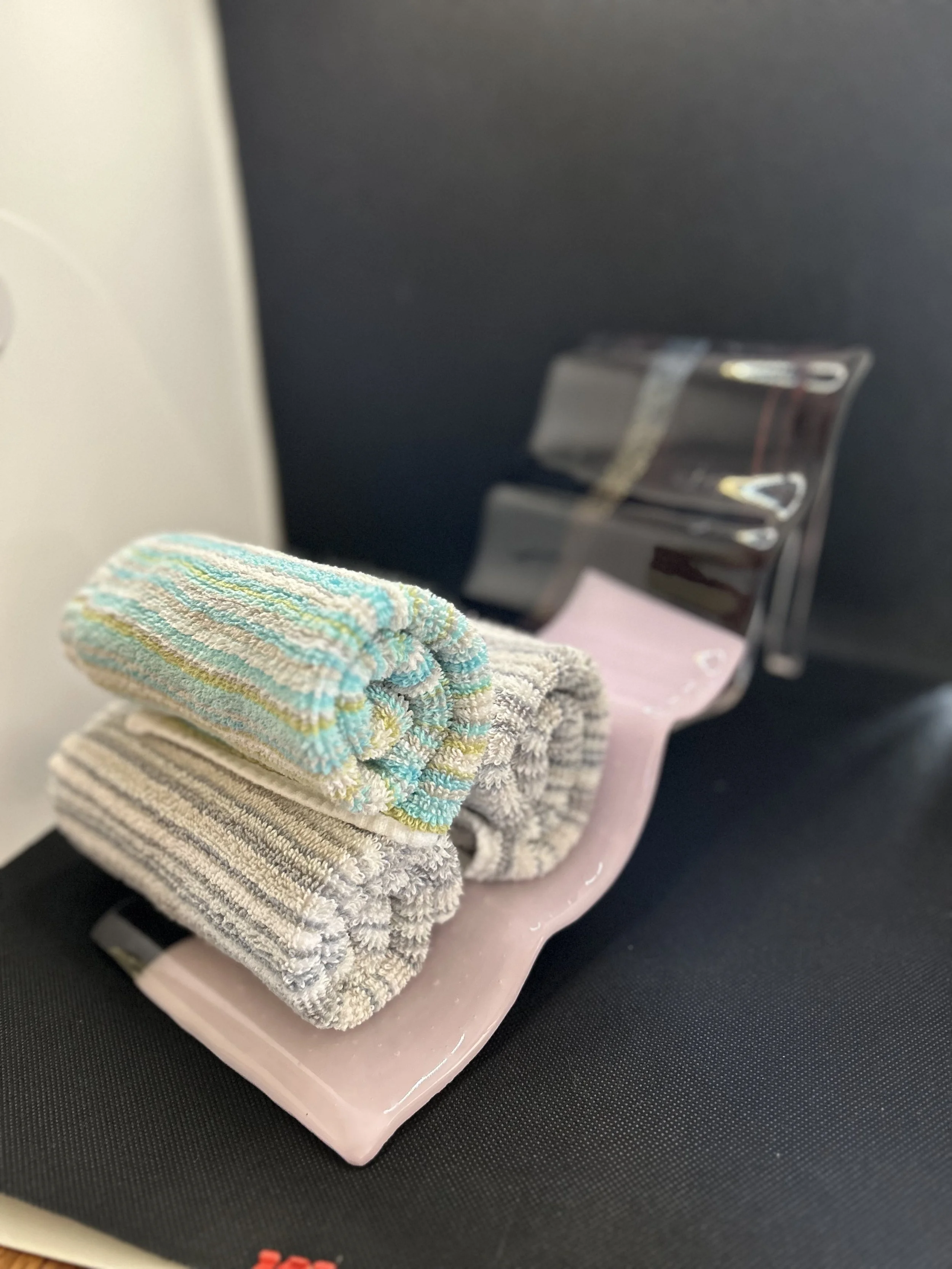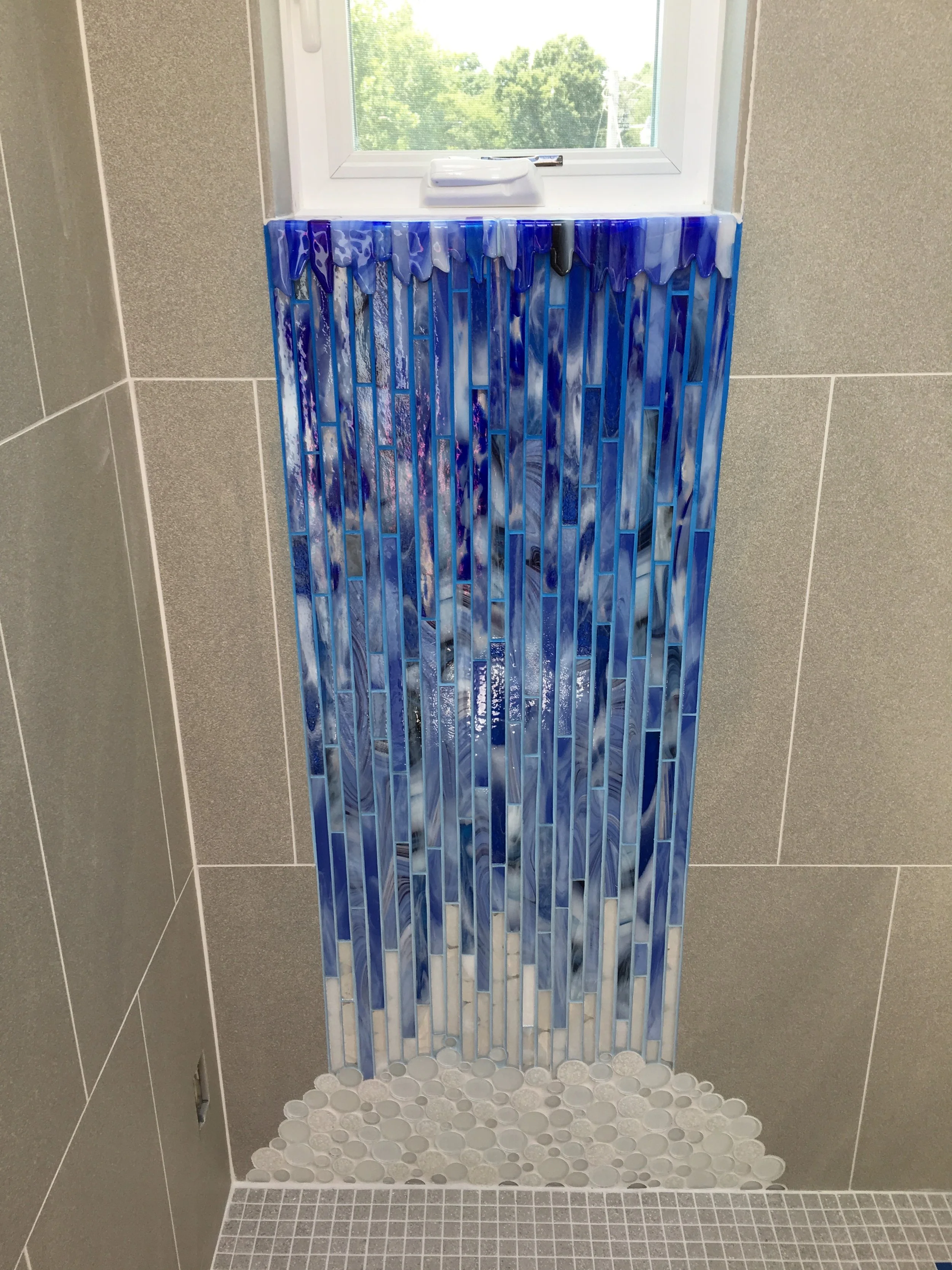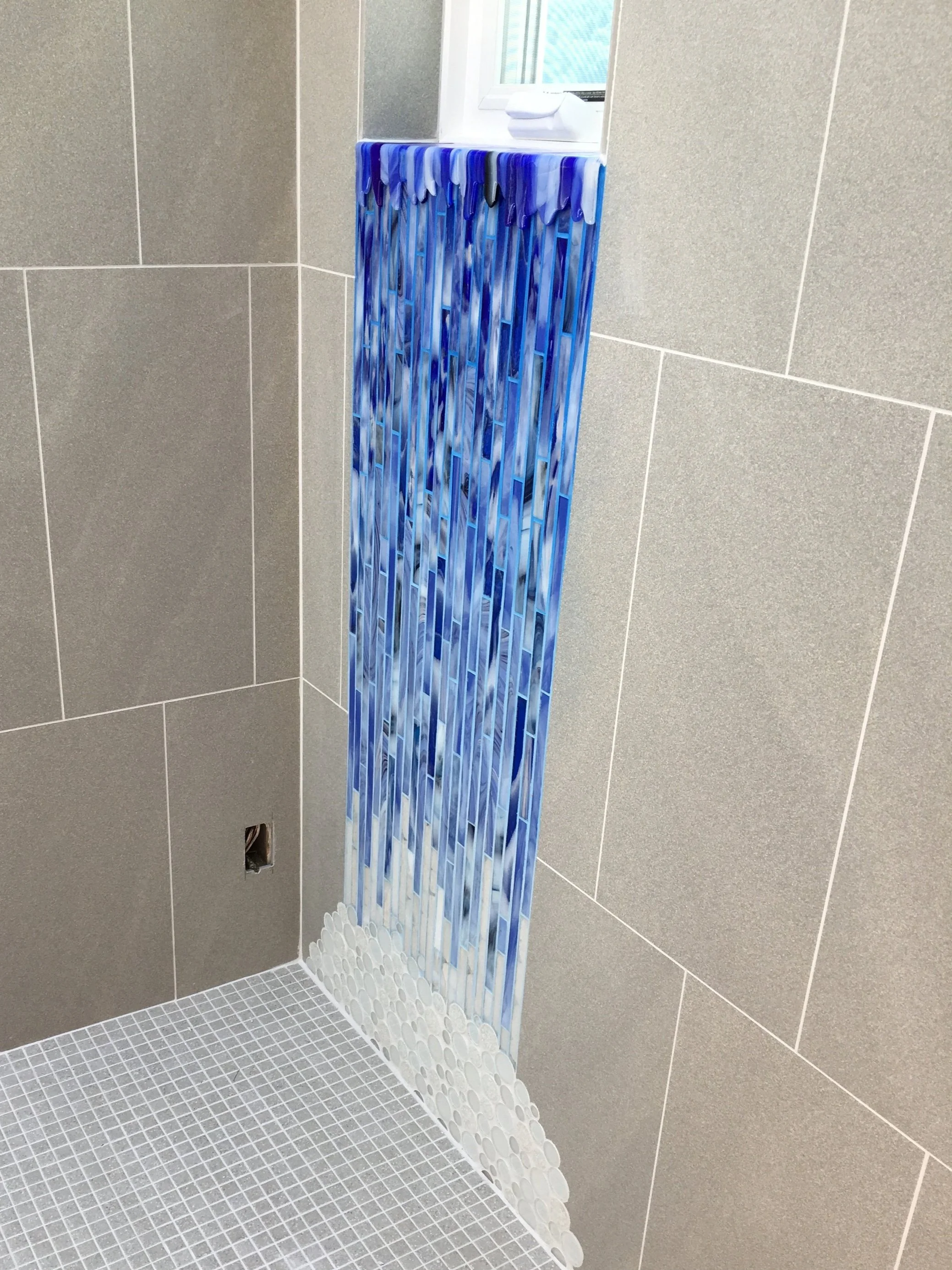 Immerse yourself in the calming ambiance of a shower accentuated by a custom glass piece that suggests a cascading waterfall. The dynamic movement and shimmering effects of the glass simulate the beauty of flowing water, creating a spa-like atmosphere that rejuvenates the senses.