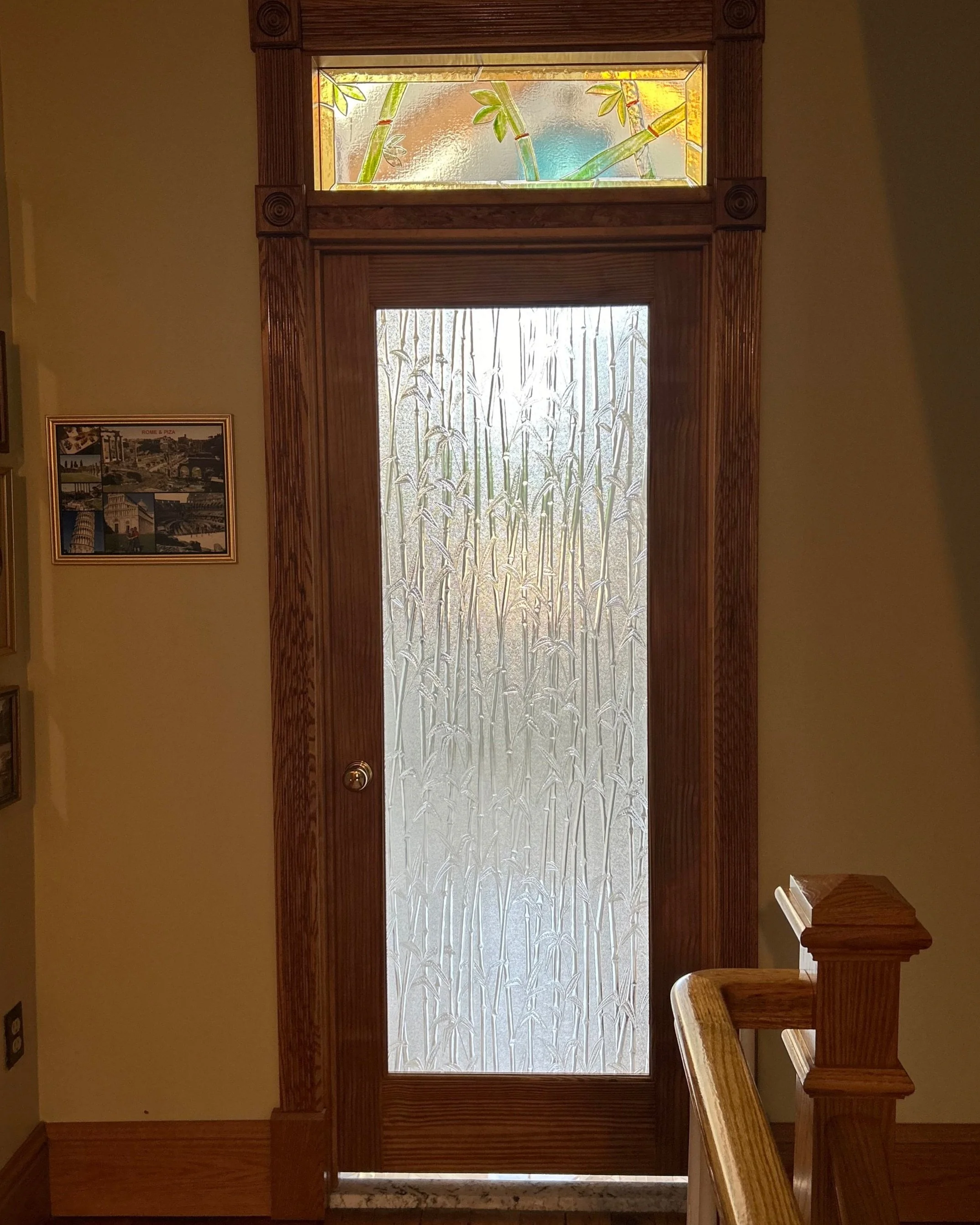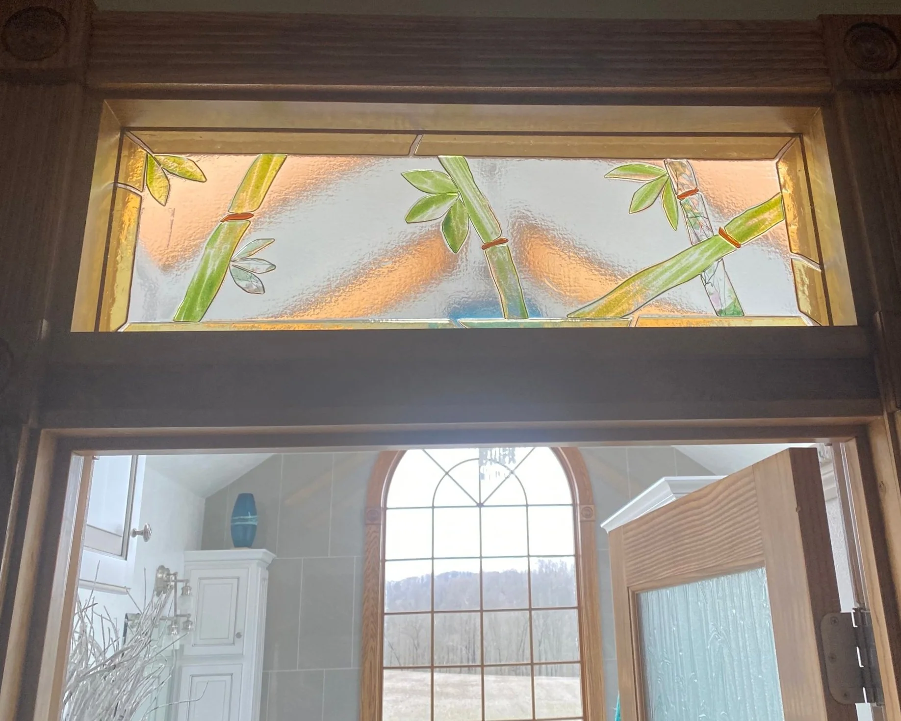 A beautiful door features a custom glass transom of delicate bamboo, capturing the serene essence of the outdoors and inviting a breath of fresh air into your home. This exquisite artwork adds a touch of tranquility and sophistication, making a striking first impression.