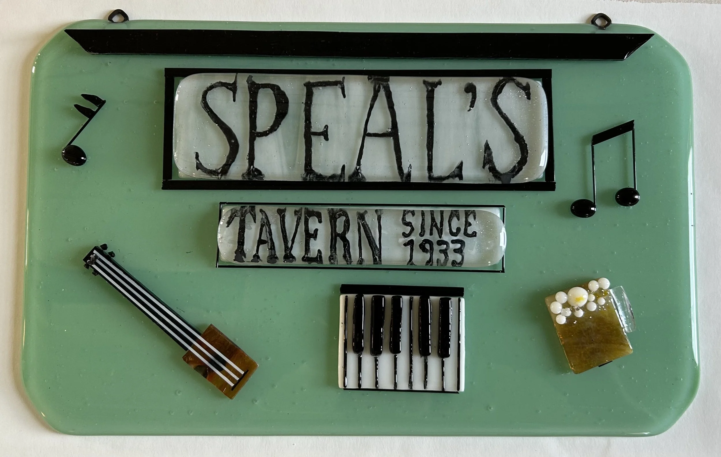 On the left, there is a custom-made glass sign specifically designed for Speal's Tavern. This unique piece showcases the tavern's identity in an artistic manner.